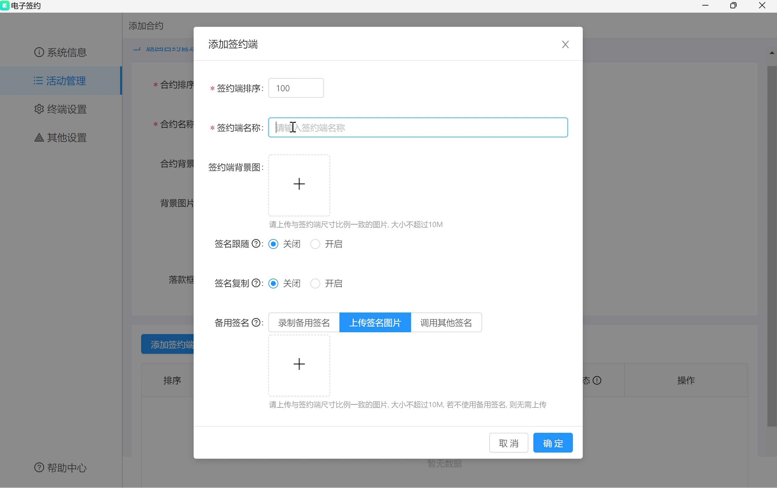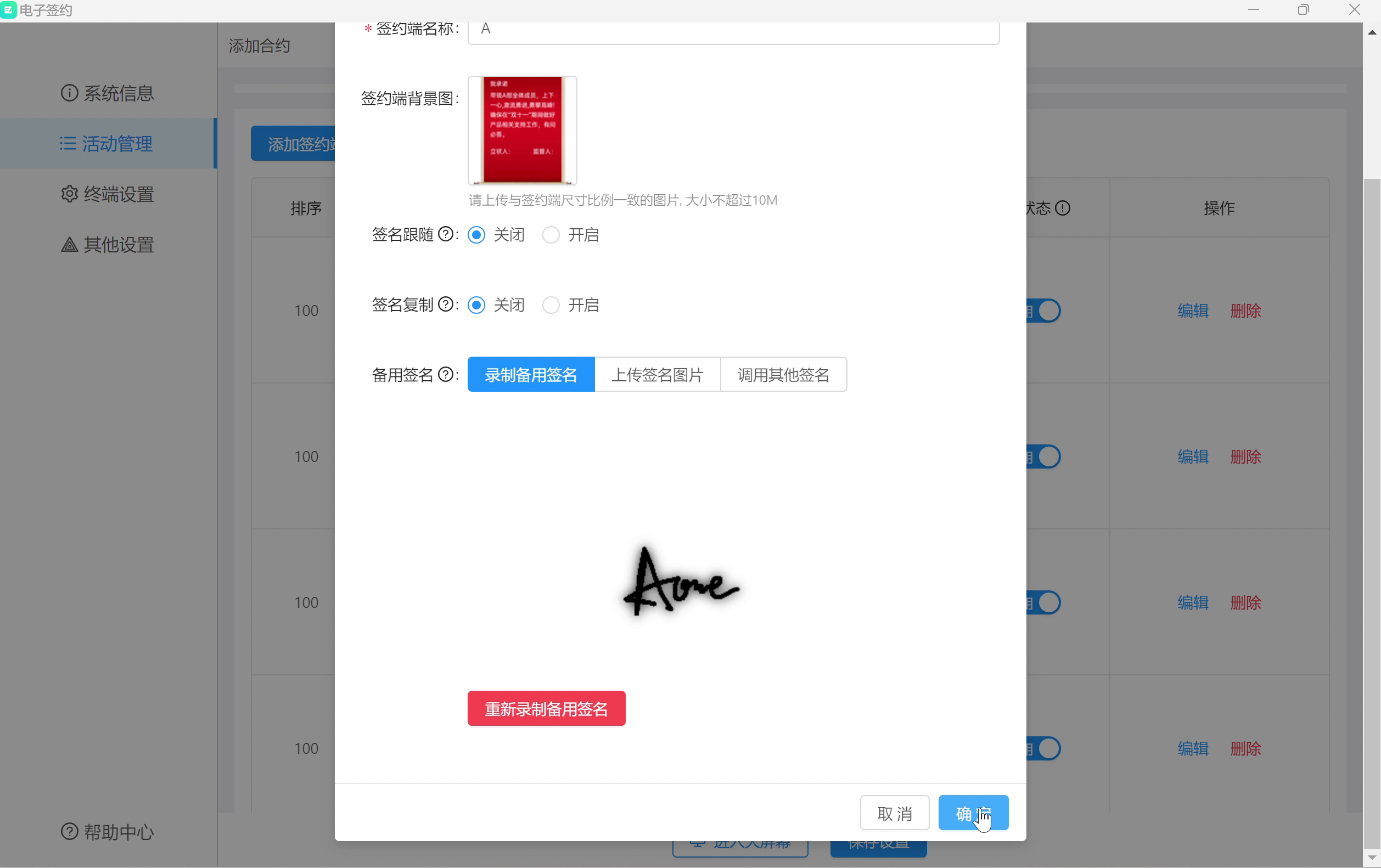 2.系统配置:预先设定好签署背景图和参与者信息,上传签署模板;