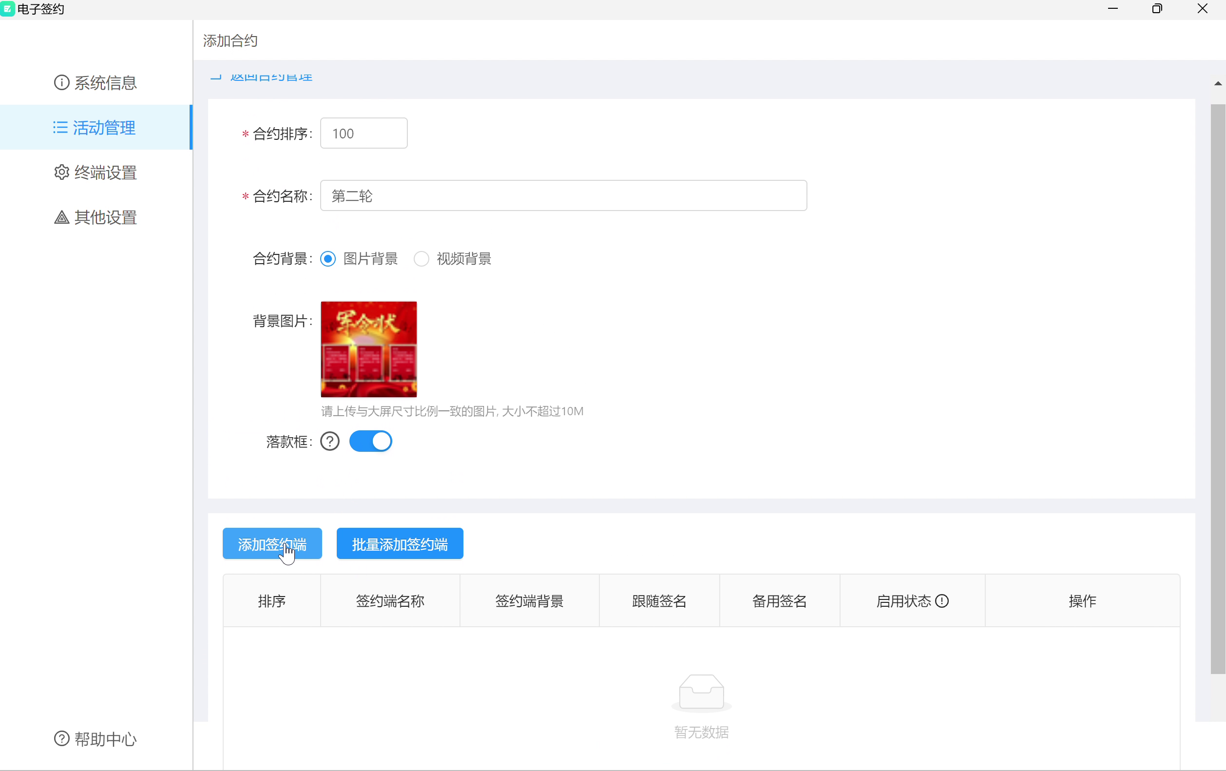 根据活动需求可以自定义添加签署轮次及签署端数量等信息。添加轮次后,注意要将签署端命名修改为对应签署人的信息,便于在后续操作中进行识别。