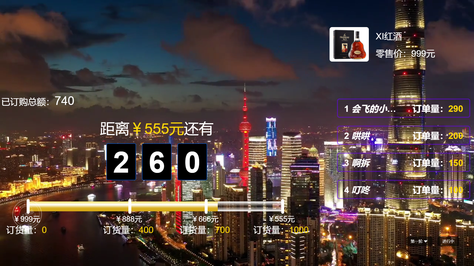 参与者操作:扫码后在手机端输入订货数量等信息,大屏端实时展示订货总量及距离下个价格的距离。