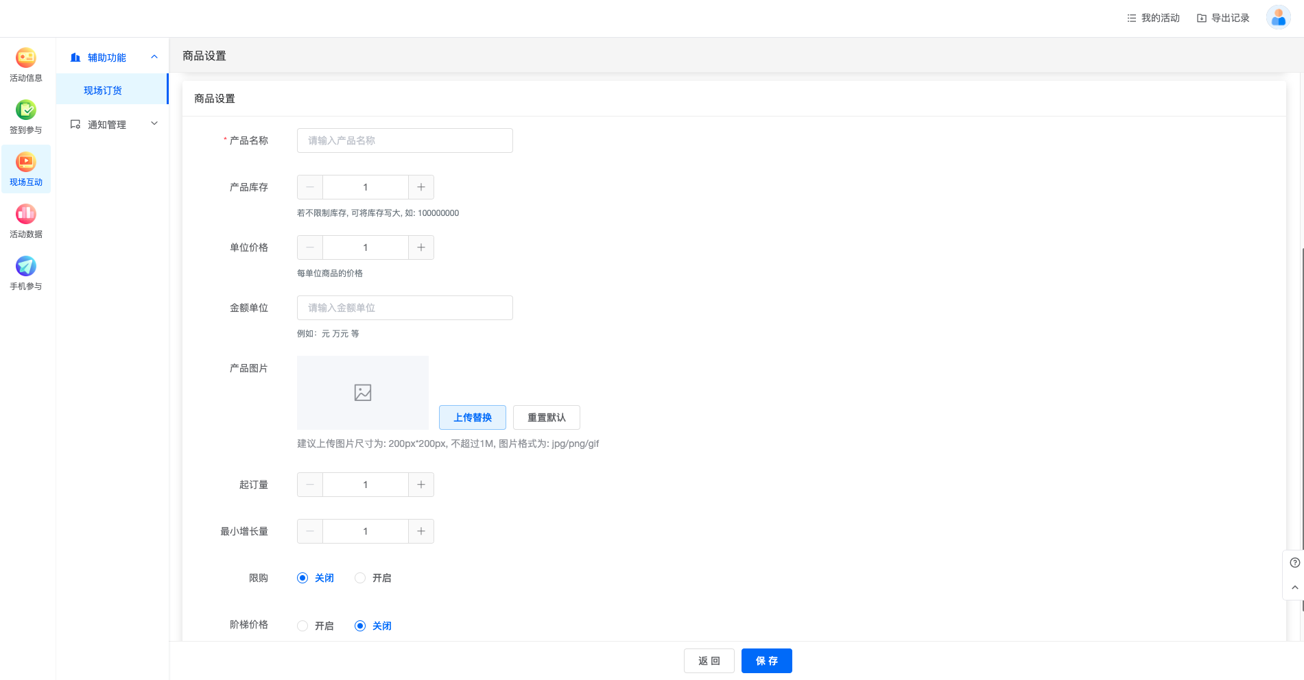 1. 订货产品设置 每个产品和订货会都是独特的,系统内置的订货阶梯编辑器可以让主办方自由地定制订货阶梯和价格区间。无论是调整订货量区间,还是设置不同的价格点,都可以轻松实现,以匹配活动的独特需求和目标。